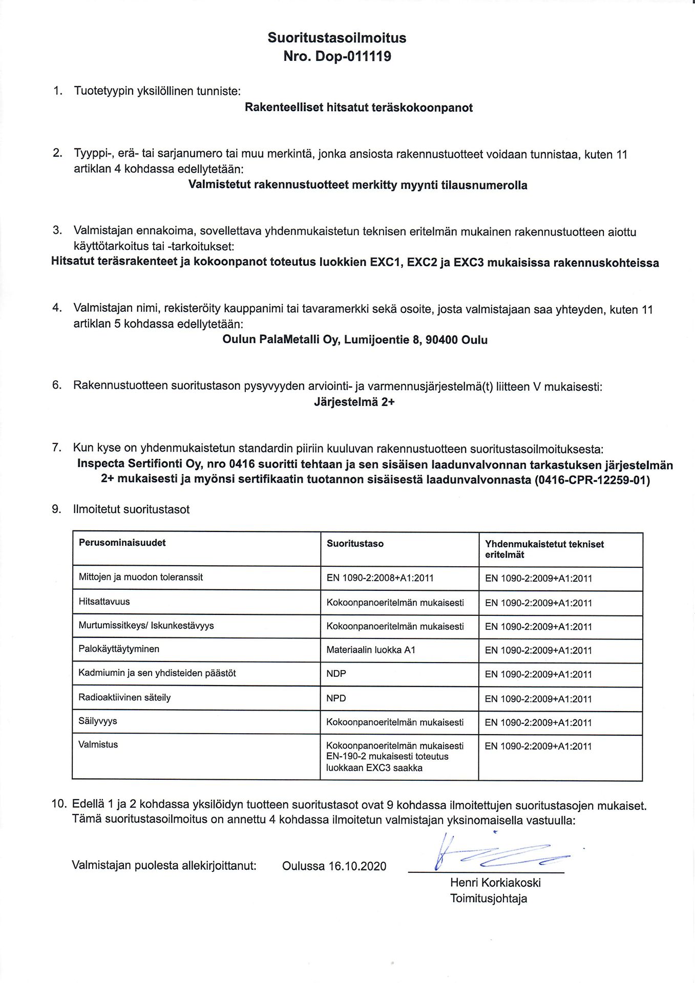 Valmistamme teräsrakenteet SFS-EN 1090-2 -standardin mukaan sertifioidun laitoksen luvalla.